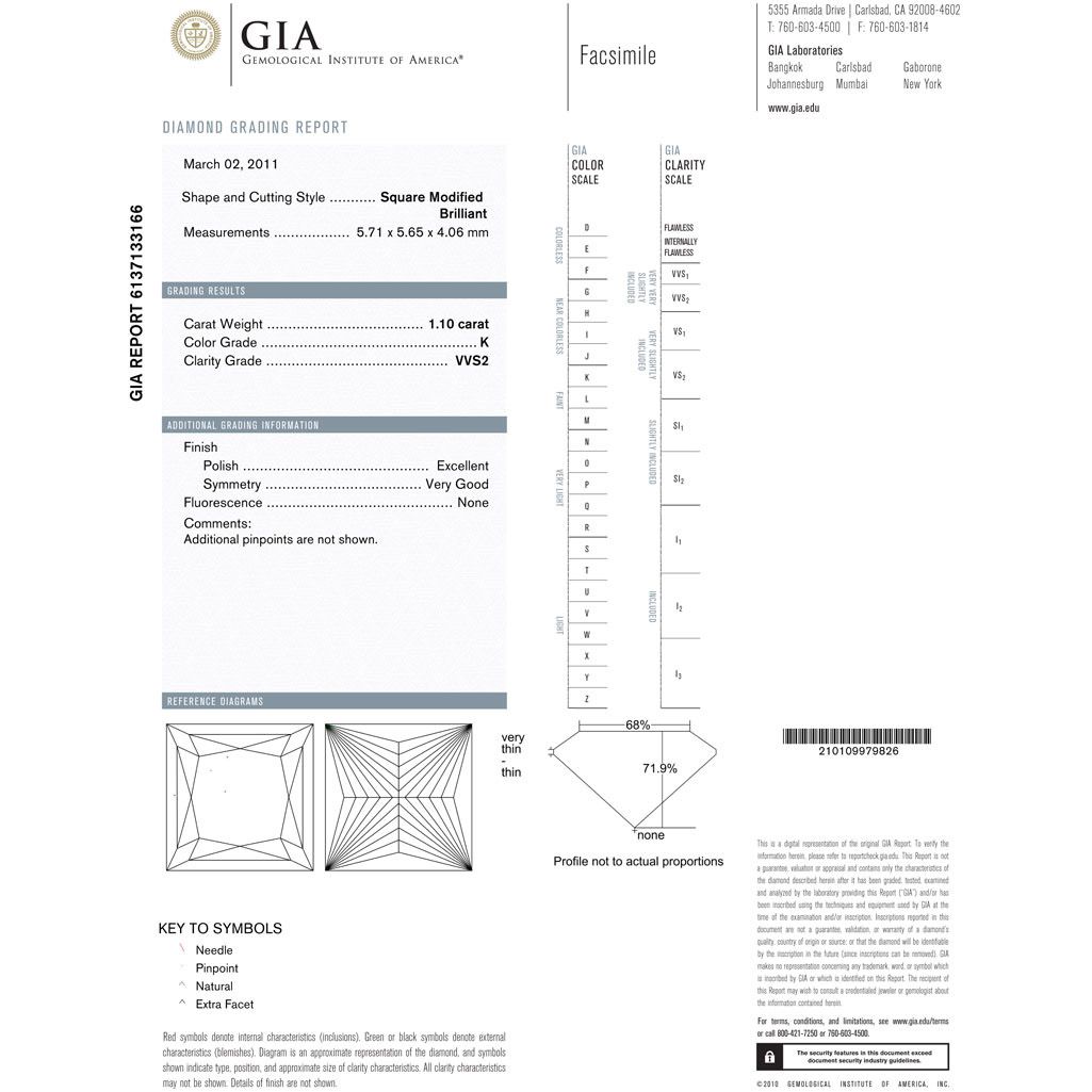 Diamond GIA Cert. Square 1.10 ctw K, VVS2 **|**|** 5.71x5.65x4.06mm;Cut Very Good; Polish Excellent; Symmetry Very Good; Fluo None; Depth 71.9%; table 68% ; MSRP: $12000