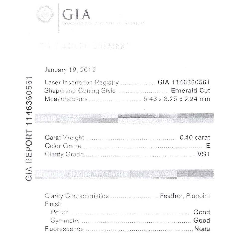 Diamond GIA Certified Emerald 0.40 ctw E,VS1 **|**|** 5.43x3.25x2.24mm;Cut Very Good; Polish Very Good; Symmetry Good; Fluo None ; MSRP: $3000