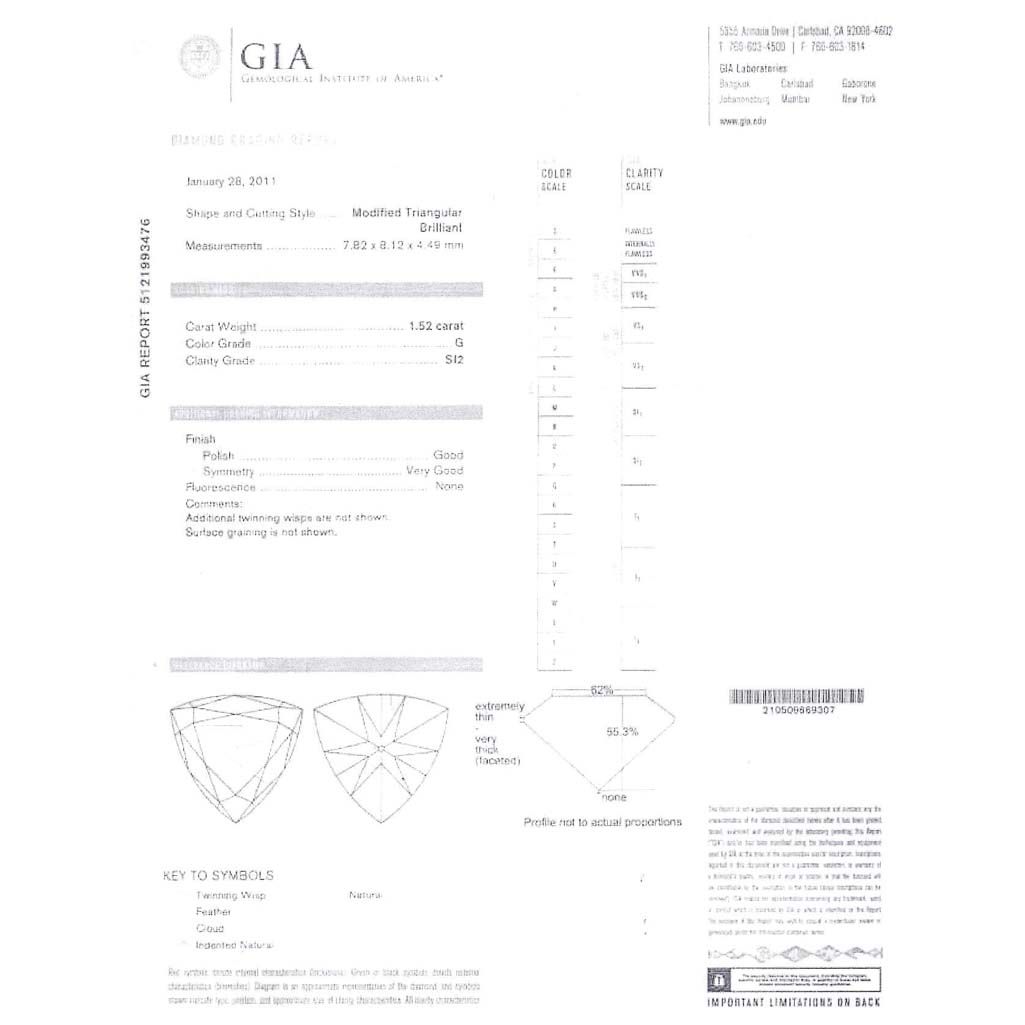 Diamond GIA Certified Modified Triangular 1.52 ct G,SI2 **|**|** 7.82x8.12x4.49mm;Cut Very Good; Polish Very Good; Symmetry Very Good; Fluo None; Depth 55.3%; Table 62% ; MSRP: $16416