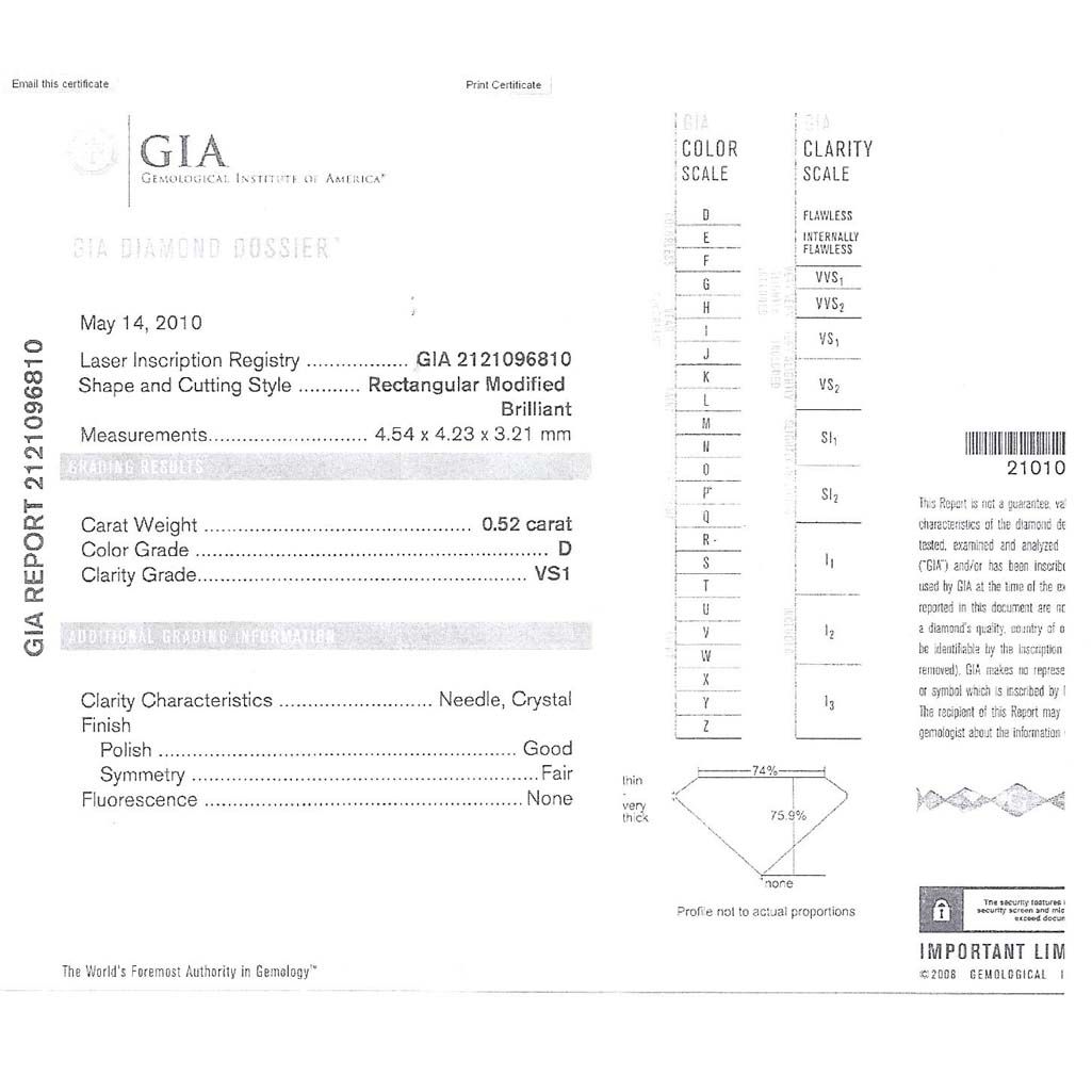 Diamond GIA Certified Rect. Mod Brilliant 0.52 ct D,VS1 **|**|** 4.54x4.23x3.21mm;Cut Very Good; Polish Very Good; Symmetry Fair; Fluo None; Depth 75.9%; Table 74% ; MSRP: $3596