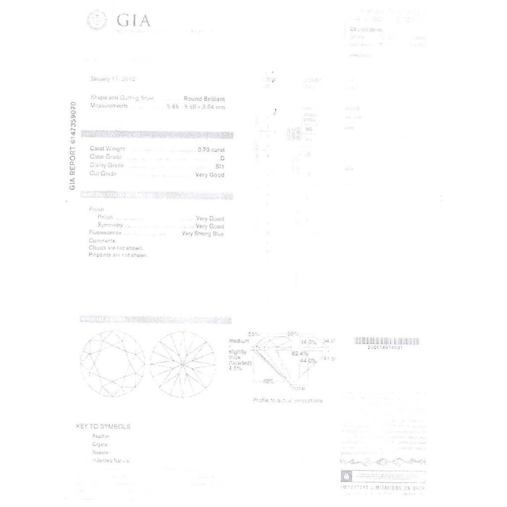 Diamond GIA Certified Round 0.70 ctw D,SI1 **|**|** 5.65x5.68x3.54mm;Cut Very Good; Polish Very Good; Symmetry Fair; Fluo Very Strong Blue; Depth 41.6%; Table 59% ; MSRP: $7480