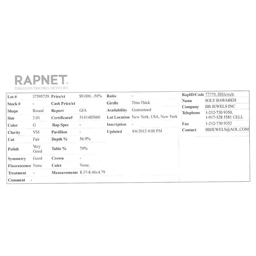 Diamond GIA Certified Round 2.01 ctw G,VS1 **|**|** 8.37x8.46x4.79mm;Cut Very Good; Polish Very Good; Symmetry Very Good; Fluo None; Depth 56.9%; Table 70% ; MSRP: $55000