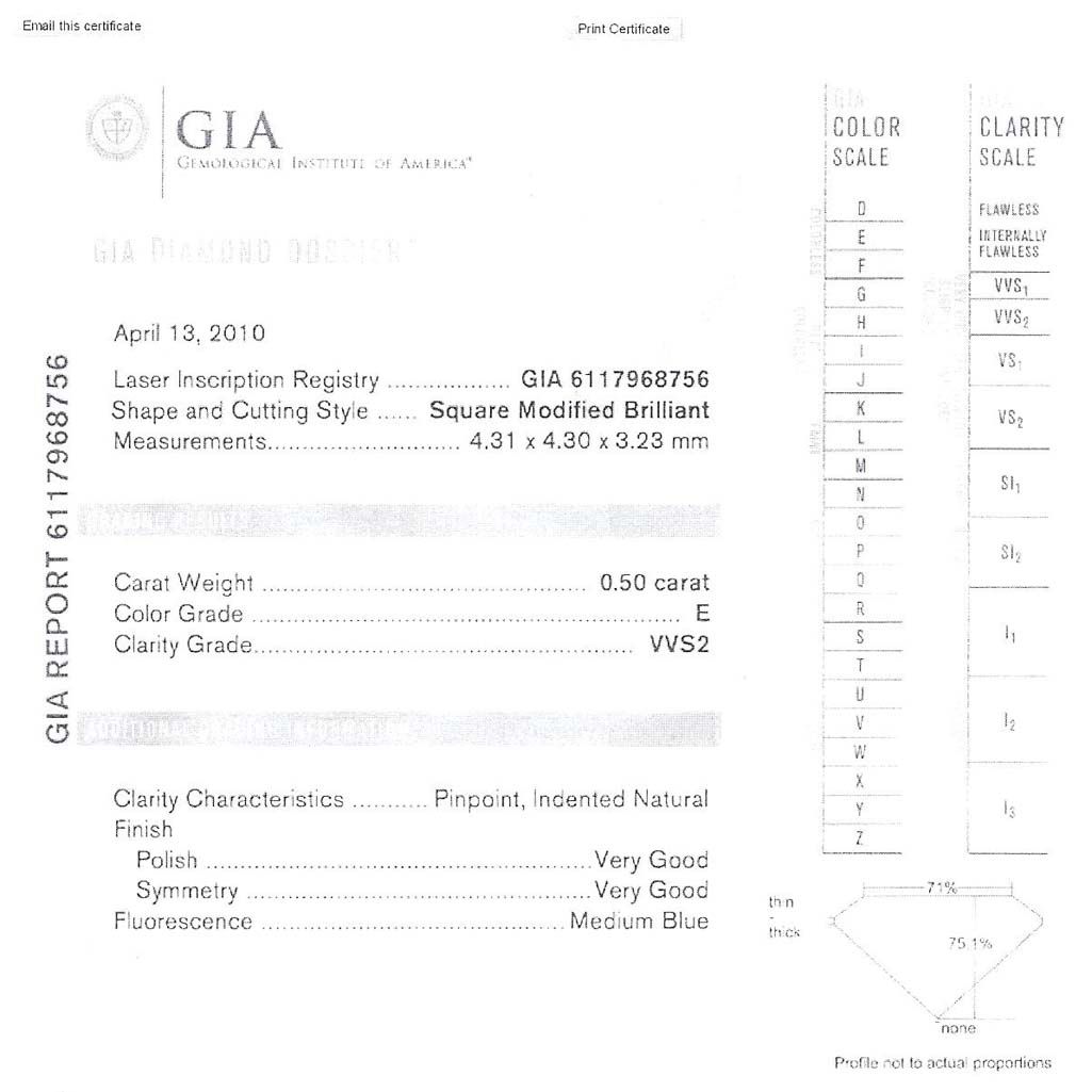 Diamond GIA Certified Square 0.50 ctw E,VVS2 **|**|** 4.31x4.30x3.23mm;Cut Very Good; Polish Very Good; Symmetry Good; Fluo Medium Blue; Depth 75.1%; Table71% ; MSRP: $3648