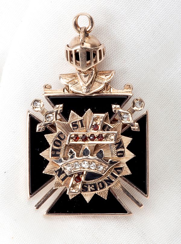 Diamond, Garnet, Onyx, 14k Yellow Gold Coat of Arms Pendant. Gross weight 14.70 grams.