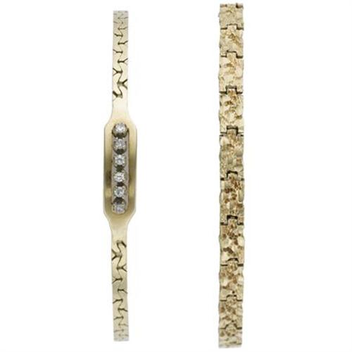 <B>Diamond, Gold Bracelet Lot</B></I><BR><BR>The lot includes: one bracelet centering single-cut diamonds weighing a total of approximatley 0.18 carat, set in 14k yellow gold with rhodium finished accents <I>(Dimensions: 7 inches x 1/4 inch)</B></I>; together with one 14k bracelet consisting of gold nugget style links <I>(Dimensions: 7 inches x 3/16 inch).</B></I> Gross weight for the lot is 15.70 grams. <B>Condition Report:</B> Very good condition.<BR><BR><BR><BR><b>Shipping:</b> Miscellaneous Collectibles, Smal (<a target="_blank" href="http://www.heritageauctions.com/common/shipping.php">view shipping information</a>)