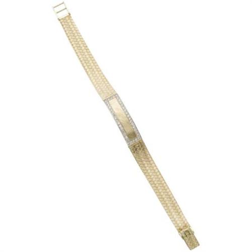 <B>Diamond, Gold Bracelet</B></I> The bracelet features a central panel, outlined by full-cut diamonds weighing a total of approximately 1.00 carat, set in 14k yellow gold, stationed by a woven gold bracelet. Gross weight 25.10 grams.<BR><I>Dimensions: 7 inches x 3/8 inch</B></I><BR><BR><b>Shipping:</b> Miscellaneous Collectibles, Smal (<a target="_blank" href="http://www.heritageauctions.com/common/shipping.php">view shipping information</a>)