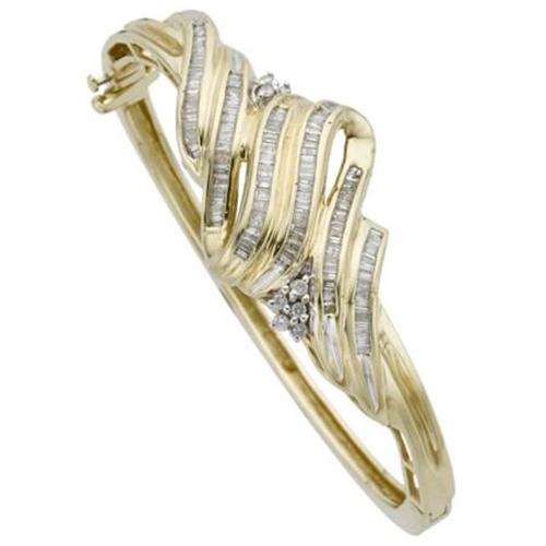 <B>Diamond, Gold Bracelet</B></I> The hinged bangle features baguette-cut diamonds, enhanced by full-cut diamonds, set in 14k yellow gold with rhodium finished accents. Total diamond weight is approximately 1.50 carats. Gross weight 27.20 grams. <BR><I>Dimensions: 7 inches x 1 inch</B></I><BR><BR><b>Shipping:</b> Miscellaneous Collectibles, Smal (<a target="_blank" href="http://www.heritageauctions.com/common/shipping.php">view shipping information</a>)