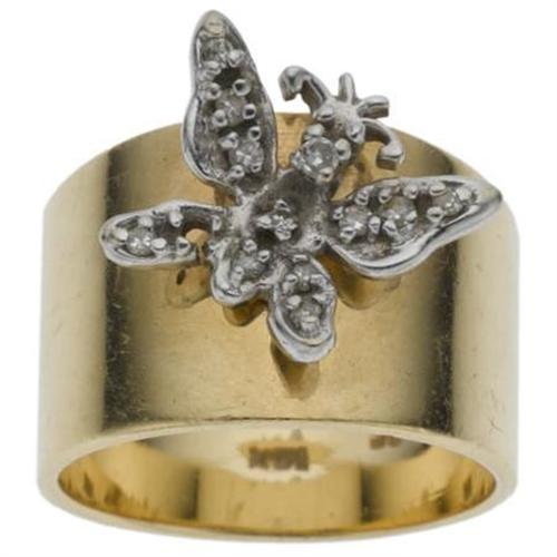 <B>Diamond, Gold Ring</B></I><BR><BR>The cigar band style ring features a three dimensional butterfly, accented by single-cut diamonds, set in rhodium finished 14k yellow gold. Gross weight 8.50 grams.<BR>*Note: Size 6 (sizeable) <B>Condition Report:</B> Good condition.<BR>2 diamonds are missing.<BR><BR><b>Shipping:</b> Miscellaneous Collectibles, Smal (<a target="_blank" href="http://www.heritageauctions.com/common/shipping.php">view shipping information</a>)