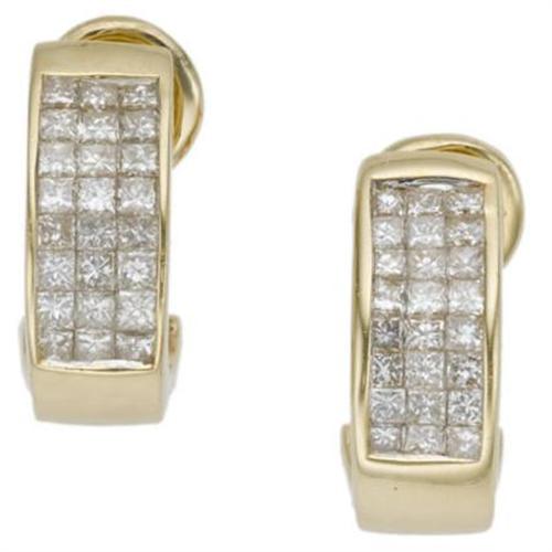 <B>Diamond, Gold Earrings</B></I> Each huggie earring features square-cut diamonds weighing a total of approximately 0.50 carat, invisibly set in 14k yellow gold, completed by a post with an omega clip back. Total diamond weight for the pair is approximately 1.00 carat. Gross weight for the pair is 3.50 grams.<BR><I>Dimensions: 9/16 inch x 3/16 inch<BR>*Note: earrings are designed for pierced ears</B></I><BR><BR><b>Shipping:</b> Miscellaneous Collectibles, Smal (<a target="_blank" href="http://www.heritageauctions.com/common/shipping.php">view shipping information</a>)