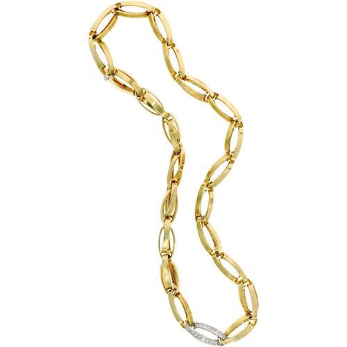 <B>Diamond, Gold Necklace, Isabelle Fa</B></I><BR><BR>The necklace is composed of 18k yellow gold links, one having rhodium finished accents, enhanced by full-cut diamonds weighing a total of approximately 0.90 carat. Signed Isabella Fa. Gross weight 85.50 grams.<BR><I>Length: 18 inches</B></I> <B>Condition Report:</B> Necklace<BR><BR>Diamonds<BR><BR>Average Color: GHI<BR><BR>Average Clarity: SI<BR><BR>Shapes: Round<BR><BR>Diamond Count: 26-50<BR><BR>Overall Condition: Very Good<BR><BR><BR><BR><b>Shipping:</b> Miscellaneous Collectibles, Smal (<a target="_blank" href="http://www.heritageauctions.com/common/shipping.php">view shipping information</a>)