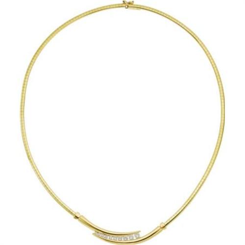<B>Diamond, Gold Necklace</B></I><BR><BR>The necklace features full-cut diamonds weighing a total of approximately 1.00 carat, set in 14k yellow gold stationed by an omega chain. Gross weight 27.10 grams. <BR><I>Dimensions: 18 inches x 3/8 inch</B></I><B>Condition Report:</B> Necklace<BR>Diamonds<BR>Average Color: G-H-I<BR>Average Clarity: VS<BR>Shapes: Round<BR>Diamond Count: 1-25 (10)<BR>Overall Count: Very Good<BR>Diamonds are VS2-SI1 clarity.<BR><BR><b>Shipping:</b> Miscellaneous Collectibles, Smal (<a target="_blank" href="http://www.heritageauctions.com/common/shipping.php">view shipping information</a>)