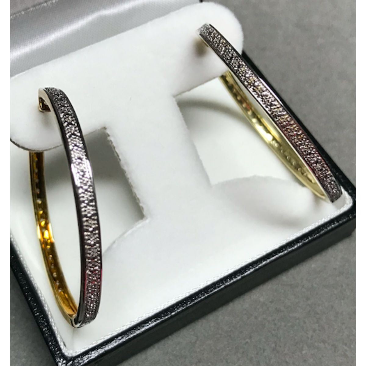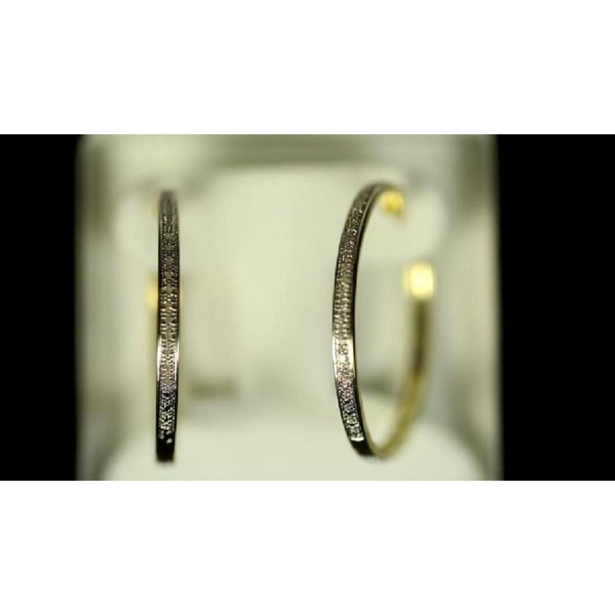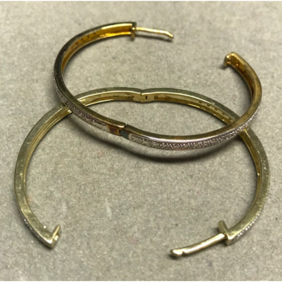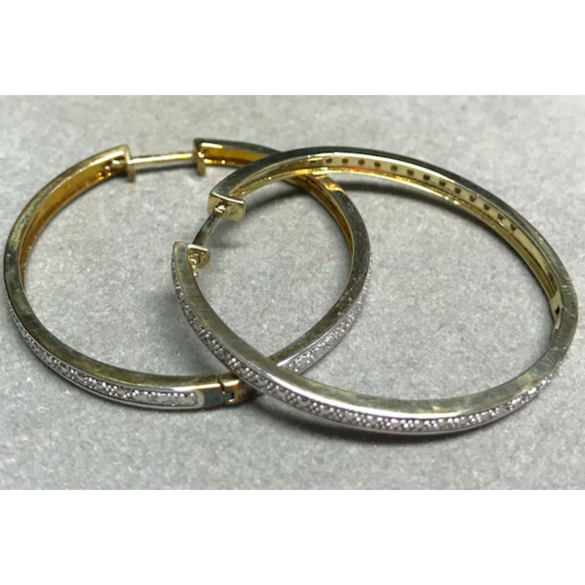 Yellow gold plated hoop style earrings with diamond chips. 1 5/8" D each. Â