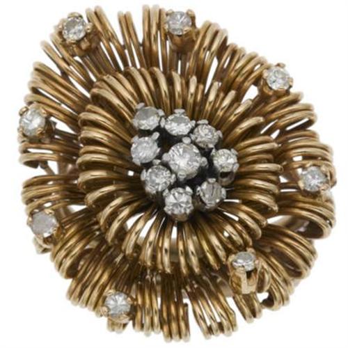 <B>Diamond, Gold Ring</B></I><BR><BR>The wire ring, designed as a flower, features full-cut diamonds weighing a total of approximately 0.35 carat, set en tremblant in 18k yellow gold with rhodium finished accents. Gross weight 12.50 grams. <BR>*Note: Size 5-1/4 (sizeable) <B>Condition Report:</B> Good condition.<BR>Sizing repair is apparent.<BR>Diamonds are I1 clarity/ J-K-L color<BR><BR><b>Shipping:</b> Miscellaneous Collectibles, Smal (<a target="_blank" href="http://www.heritageauctions.com/common/shipping.php">view shipping information</a>)