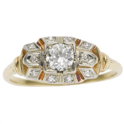 <B>Diamond, Gold Ring</B></I><BR><BR>The ring features a European-cut diamond measuring 4.85 - 4.80 x 2.60 mm and weighing approximately 0.35 carat, enhanced by single-cut and single European-cut diamonds, set in 14k yellow gold with rhodium finished accents. Total diamond weight is approximately 0.50 carat. Gross weight 2.20 grams. <BR>*Note: Size 8 (sizeable) <B>Condition Report:</B> Good condition.<BR>The featured European-cut diamond is chipped, and loose in the setting.<BR><BR><b>Shipping:</b> Miscellaneous Collectibles, Smal (<a target="_blank" href="http://www.heritageauctions.com/common/shipping.php">view shipping information</a>)