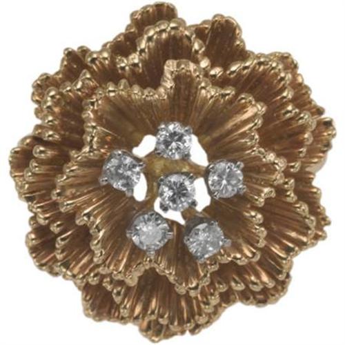 <B>Diamond, Gold Ring</B></I><BR><BR>The ring, designed as a flower, features full-cut diamonds weighing a total of approximately 0.25 carat, set in 14k textured yellow gold. Gross weight 11.80 grams. <BR>*Note: Size 4-1/2 (sizeable) <B>Condition Report:</B> Very good condition.<BR>Sizing butterfly is attached to shank and is easily removed.<BR><BR><b>Shipping:</b> Miscellaneous Collectibles, Smal (<a target="_blank" href="http://www.heritageauctions.com/common/shipping.php">view shipping information</a>)