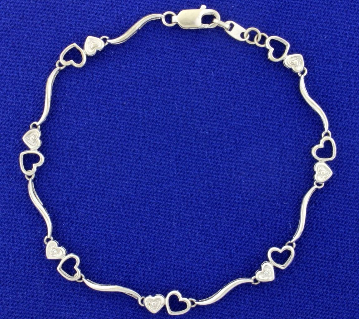 In 10K white gold it is 7 1/2 inches long and contains two .01ct diamonds with lobster clasp. 3.2g