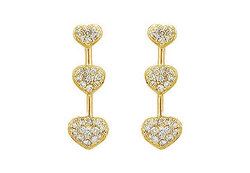 Three diamond encrusted hearts are set inline with sleek gold bars in between. Each heart motif is accented with multiple prong-set brilliant-cut diamonds. Made in 14K yellow gold these earrings have a total weight (TDW) of 0.50 ct.