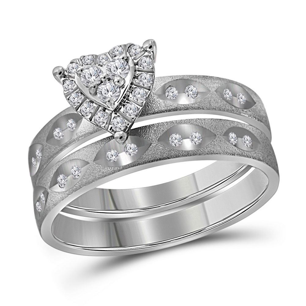 14kt White Gold His Hers Round Diamond Heart Matching Wedding Set 1/4 Cttw.