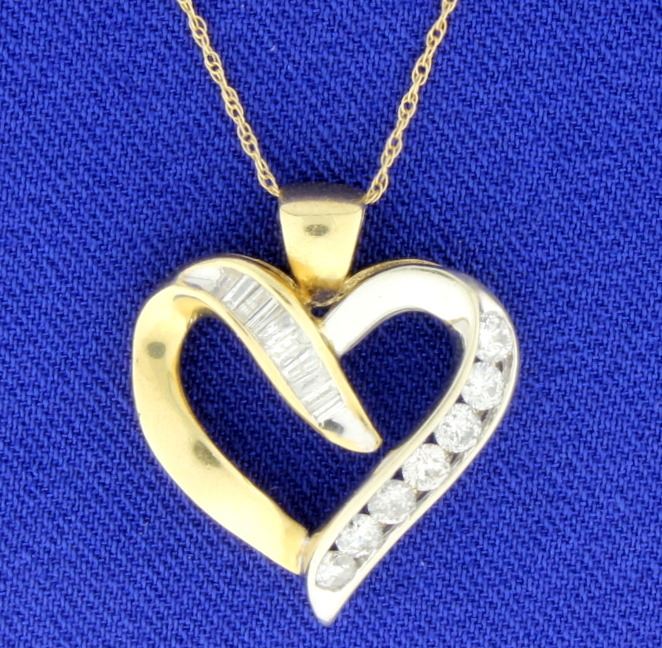 Total weight of diamonds is 1/2 carat & chain is 18 inches, 10k yellow gold. There are 7 brilliant cut larger diamonds, clarity I-1, color "H-I". There are 10 baguette diamonds in a channel clarity I-1/2, color "H-I-J". 2.9g
