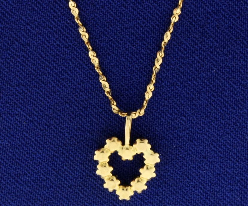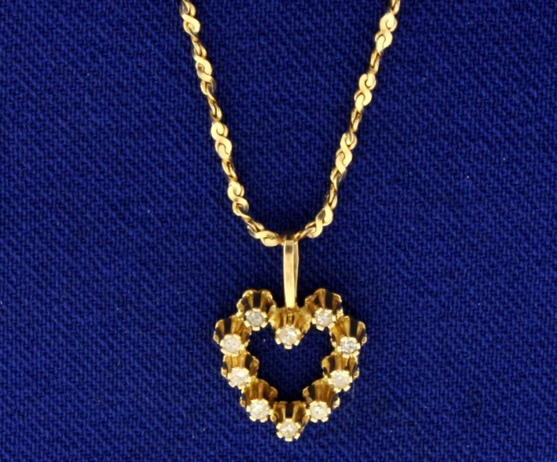 In 14k yellow gold. Pendant contains ten high quality .01ct round diamonds, SI clarity/H color. 20 Inch long twisting S link chain. 1/2" pendant with bale. 3.0g.