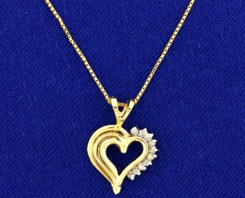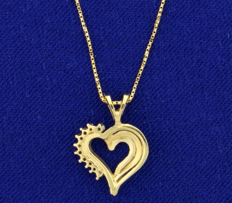 In 14k yellow gold. Contains ten high quality 1/2pt diamonds. 3/4" long pendant with bale and 22 1/2" long neck chain. 2.4g.