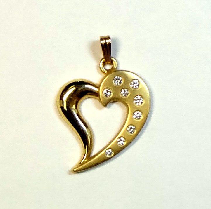 14k Gold Heart Pendant containing 9 flush set diamonds. This was a custom made piece, acid tests 14k gold. Wt. 2.87 dwt.