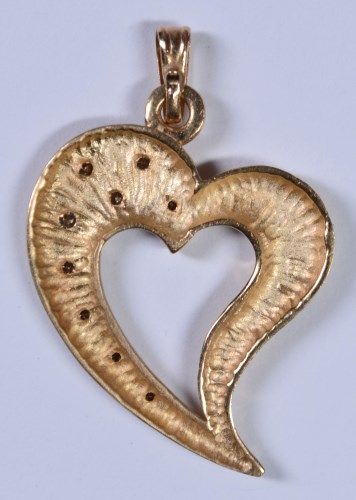 14k Gold Heart Pendant containing 9 flush set diamonds. This was a custom made piece, acid tests 14k gold. Wt. 2.87 dwt.