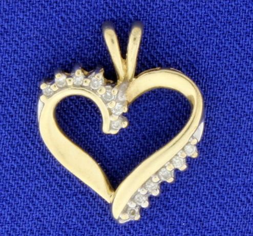 In 10K yellow & white gold, there are thirteen 1/2pt diamonds in the 3/4 inch long pendant. 2.2g