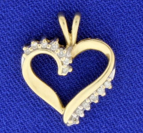 In 10K yellow & white gold, there are thirteen 1/2pt diamonds in the 3/4 inch long pendant.       2.2g