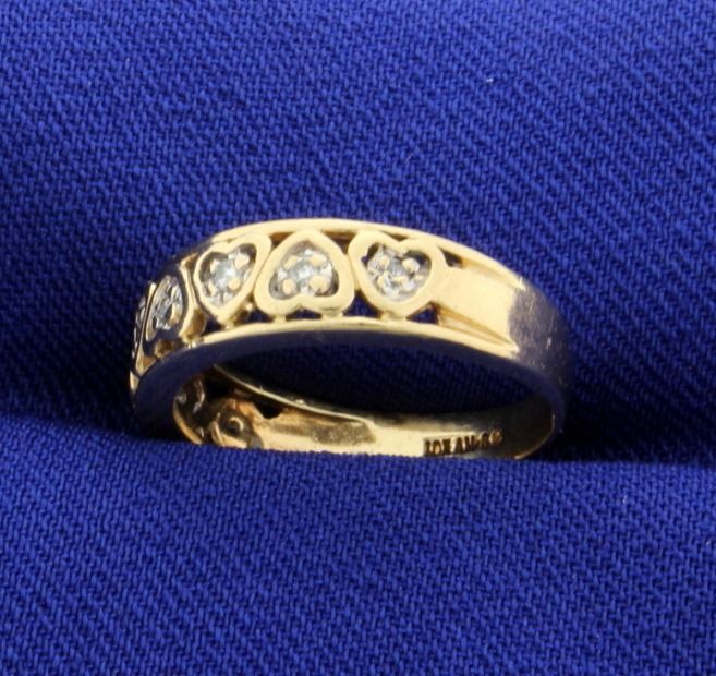 In 10K yellow gold, the ring contains eight 1pt diamonds. Size 5 2.4g