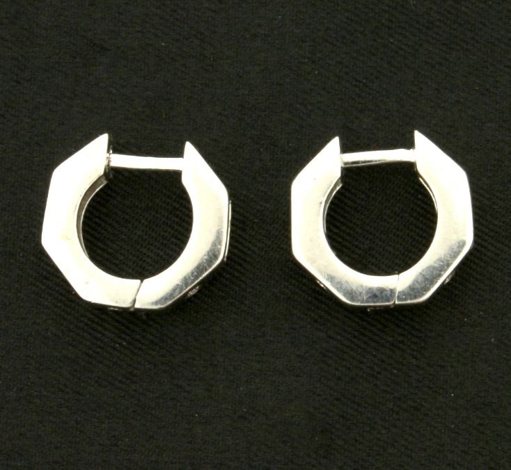 In 14k white gold. 1/2" diameter. Each earring contains two .01ct high quality round brilliant diamonds and five .005ct baguette high quality diamonds, SI clarity/H color. 3.3g.