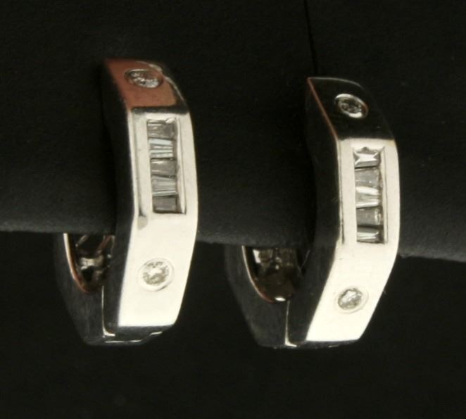 In 14k white gold. 1/2" diameter. Each earring contains two .01ct high quality round brilliant diamonds and five .005ct baguette high quality diamonds, SI clarity/H color. 3.3g.