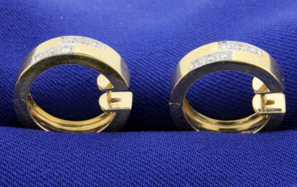 These diamond huggy style earrings are beautifully set in 14k yellow gold. The 12 diamonds weigh a total of a 1/4 carat. The diamonds are VS-SI clarity and F-G color. These earrings fit close to the ear and are 3/4" in diameter. 9.6g