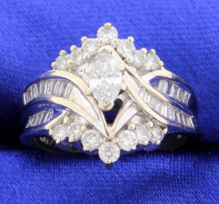 Diamond Keepsake Ring set in 14k white gold. This fantastic ring offers a center marquise cut diamond that weighs 0.37 carats, SI clarity and H color. The balance of the round brilliant cuts and baguettes total approximately another carat of SI clarity and G-H-I color diamonds!! Total diamond weight is 1.37 carats. 7.7g Size 8