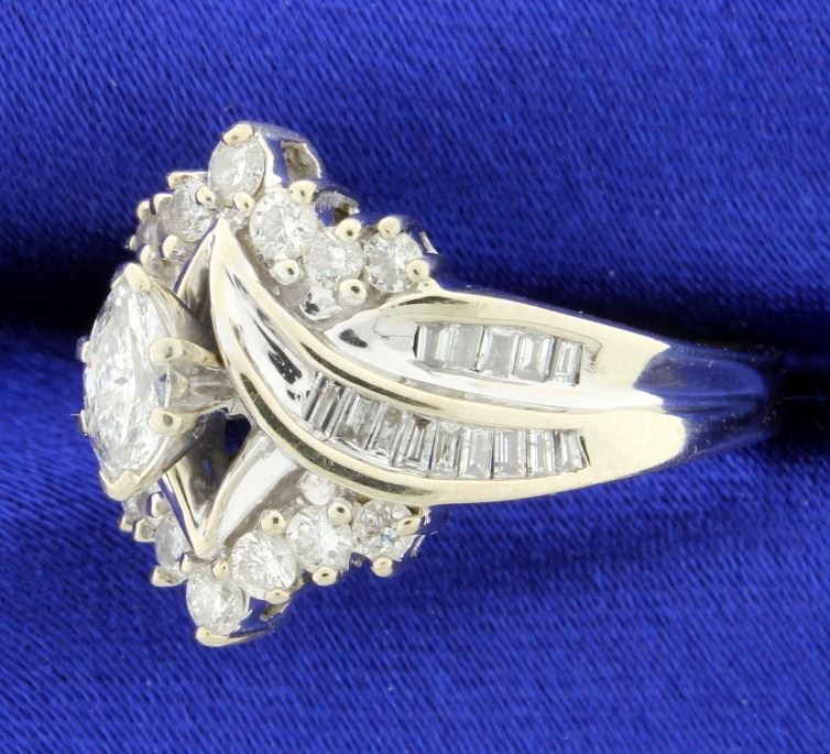 Diamond Keepsake Ring set in 14k white gold. This fantastic ring offers a center marquise cut diamond that weighs 0.37 carats, SI clarity and H color. The balance of the round brilliant cuts and baguettes total approximately another carat of SI clarity and G-H-I color diamonds!! Total diamond weight is 1.37 carats. 7.7g Size 8