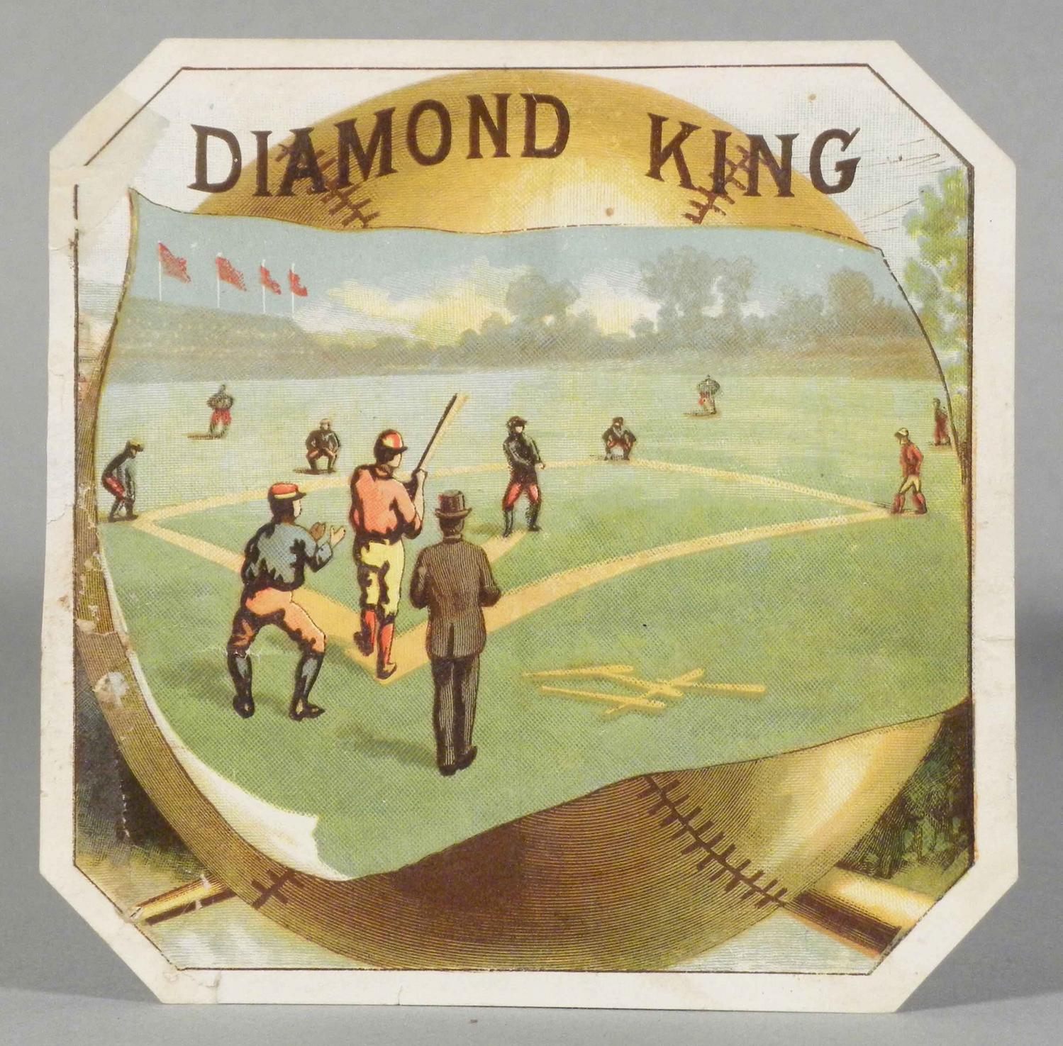 Diamond King Cigar Box Sample Label. Geo. S. Harris & Sons. Rare baseball image. Restoration on left edge otherwise very good condition. 4 1/4 inches square w/o corners. Starting bid $300