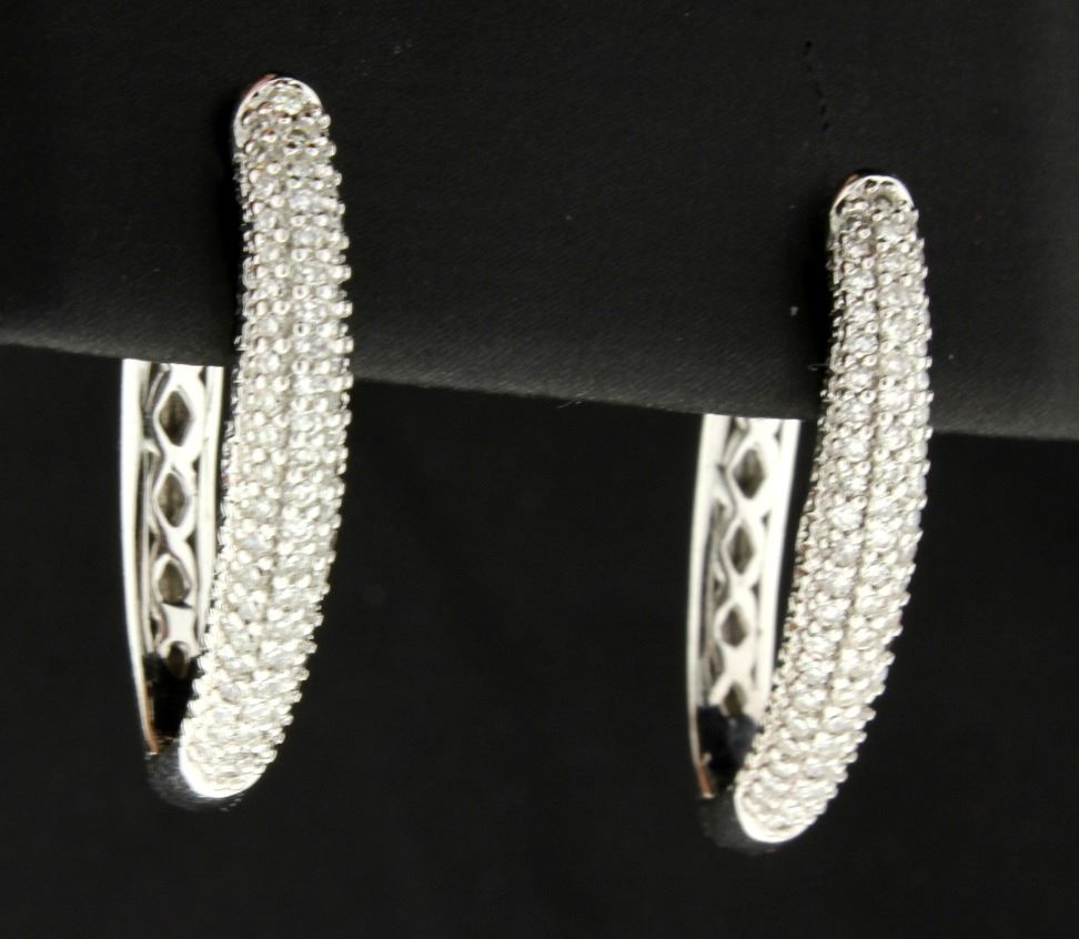 These fantastic 14k white gold oval hoop style earrings have 150 brilliant cut, micro set, diamonds that total 2 carats! The diamonds are very white with VS-SI clarity and F-G-H color. These are like new and are 1" long. These earrings have a hinged closure for easy on and off. These earrings are very high end and look like new. 5.6g