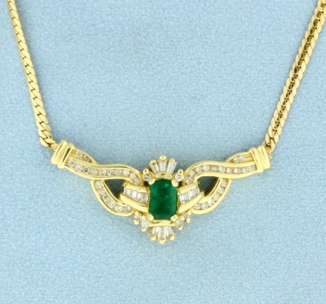 In 14K yellow gold it contains a 7x5mm emerald cut natural emerald with great deep color! Also contains 1ct total weight of high quality round & baguette diamonds with SI clarity/ H color. The necklace is 17 1/2 inches long. 8.7g