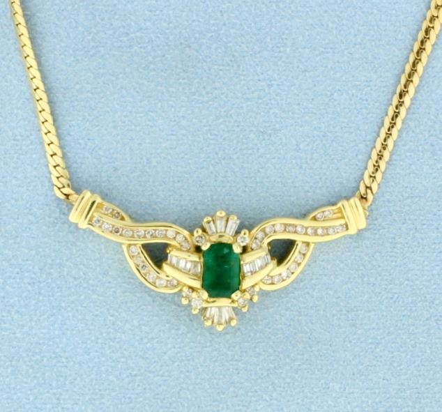 In 14K yellow gold it contains a 7x5mm emerald cut natural emerald with great deep color! Also contains 1ct total weight of high quality round & baguette diamonds with SI clarity/ H color. The necklace is 17 1/2 inches long. 8.7g