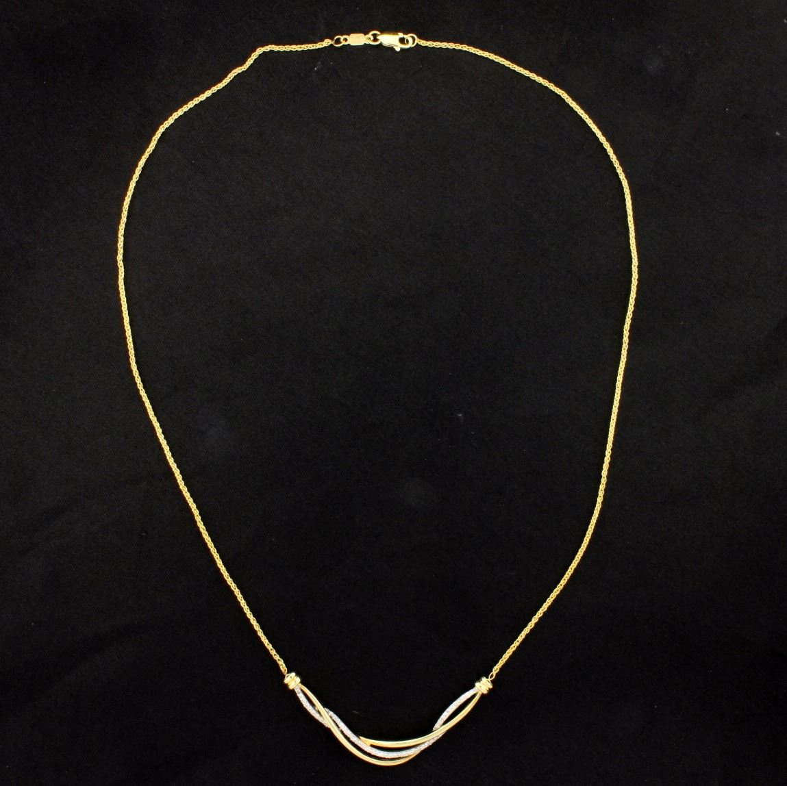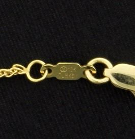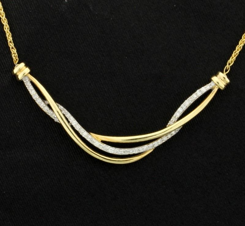 In 10K yellow gold, there are fifty 1/2pt diamonds. The necklace is 17 1/2 inches long and has a lobster clasp. 4.4g