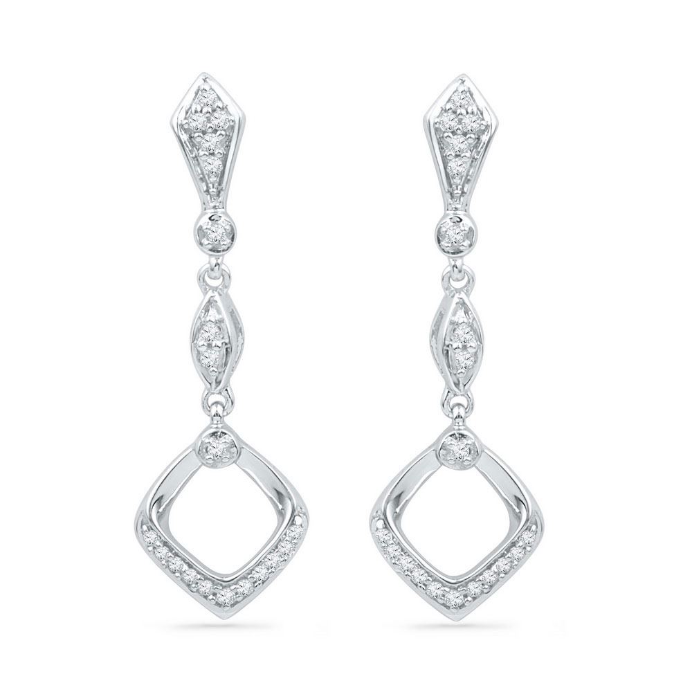 10kt White Gold Womens Round Diamond Offset Square Dangle Earrings 1/6 Cttw