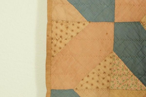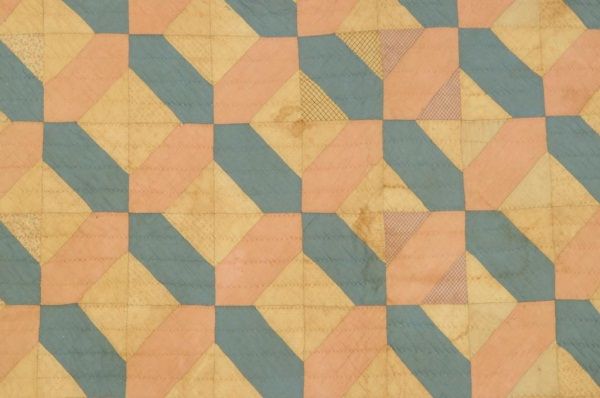 Blue, pink, and cream colored quilt measures 65 1/2" wide x 76" long. Has W.H. initials on bottom corner.