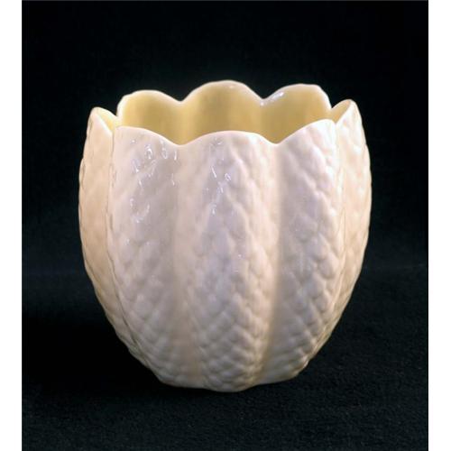 Delicate cream color Belleek vase / planter with diamond pattern design and a pearl-like luster interior. It is marked on the underside with a green Belleek Ireland mark. In very good condition as shown.