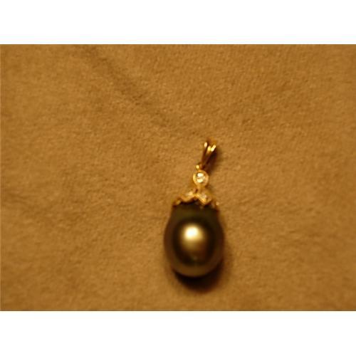 Pretty 18kt yellow gold diamond and black cultured pearl teardrop shape pendant set with one large teardrop shaped dark toned black cultured pearl with rose overtone set in an 18kt top accented by 5 small single cut diamonds. Very pretty piece!