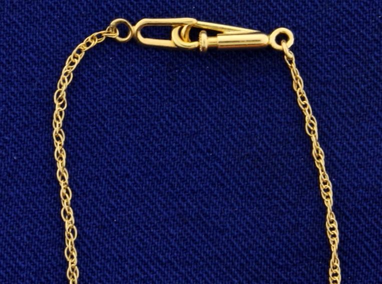 In 14k yellow gold. Contains a high quality .15ct diamond of SI1 clarity/I color with lots of sparkle and brilliance, completely eye clean. 18" long chain with a plunger clasp. 1.6g.