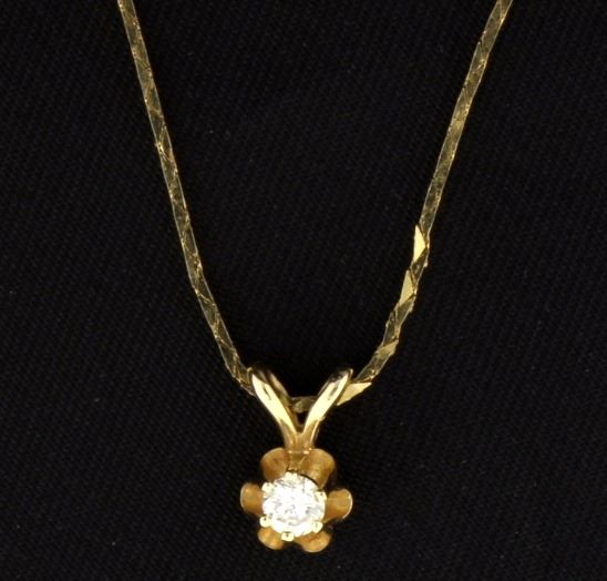 In 14k yellow gold. Contains a 10 point round diamond set in flower shaped pendant. Diamond is I-1 clarity/J color. 1.7g