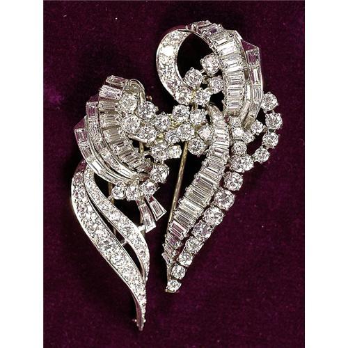 <Our item number 141142><B>Diamond, Platinum Double Clip Brooch.</B> Decorated by 49 baguette and 69 round full-cut diamonds, all weighing a total of approximately 10.00 carats, gross weight 33.30 grams, the clips can be worn either as one large brooch or two seperate brooches, circa 1950's. <BR>Estimated Value $10,000 - 14,000. <BR><BR>Our item number 141142<BR><IMAGES><P ALIGN="CENTER"><IMG SRC="http://www.goldbergcoins.net/liveauction/49jpegs/141142.jpg"> </P></IMAGES>