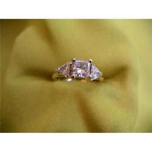 ENGAGEMENT RING. This is a 14K yellow gold diamond ring with 14K white gold prongs. The ring contains one center princess cut diamond. There are two triangular diamonds, one on each side of the square diamond. The square diamond contains inclusions, but these ARE NOT VISIBLE to the unaided eye. There is a total weight of approximately one carat(1.08 carats). The ring has been appraised. Of course, this is so good looking for the right hand, but this is very lovely for an engagement ring with a beautiful contemporary look, with the square and the rectangles of the trillions, on each side of the center diamond. It is BEAUTIFUL FOR YOU. The size is 5 1/2. A jeweler can size the ring to fit.