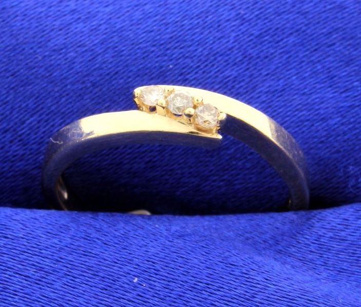 Beautiful diamond "pre-engagement or promise" ring. This lovely piece is 10k yellow gold and has three diamonds set at the center, 0.10 carats total, SI clarity and J-K color. Size 7 1.9g
