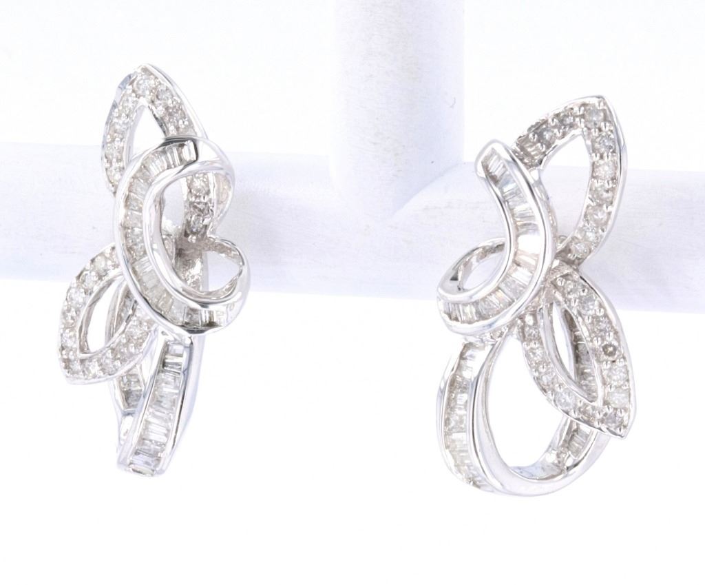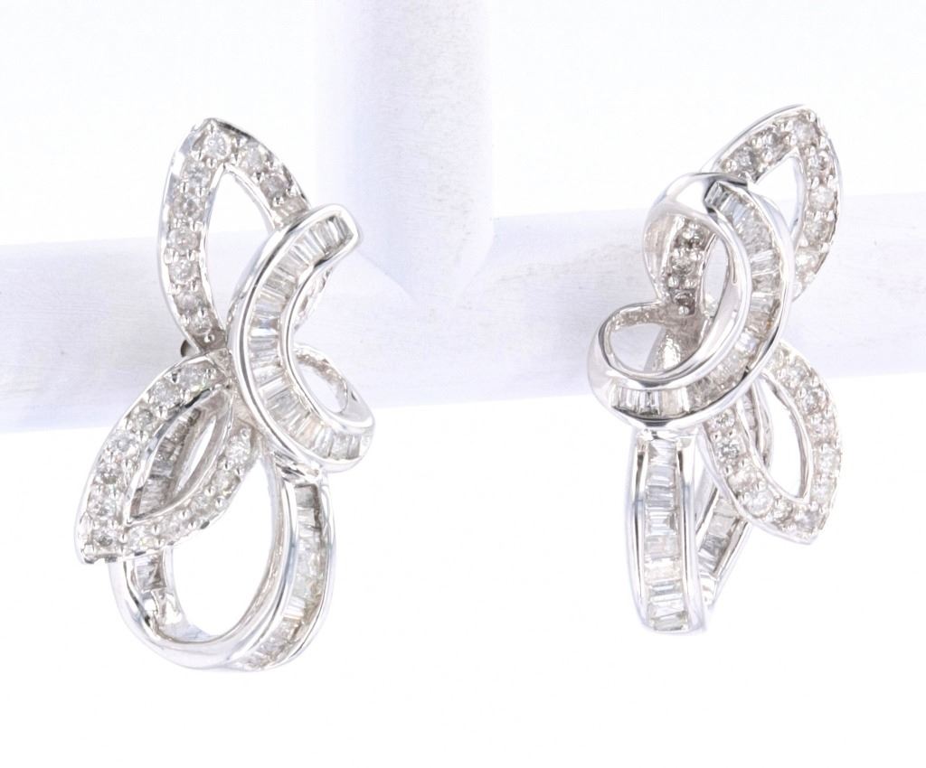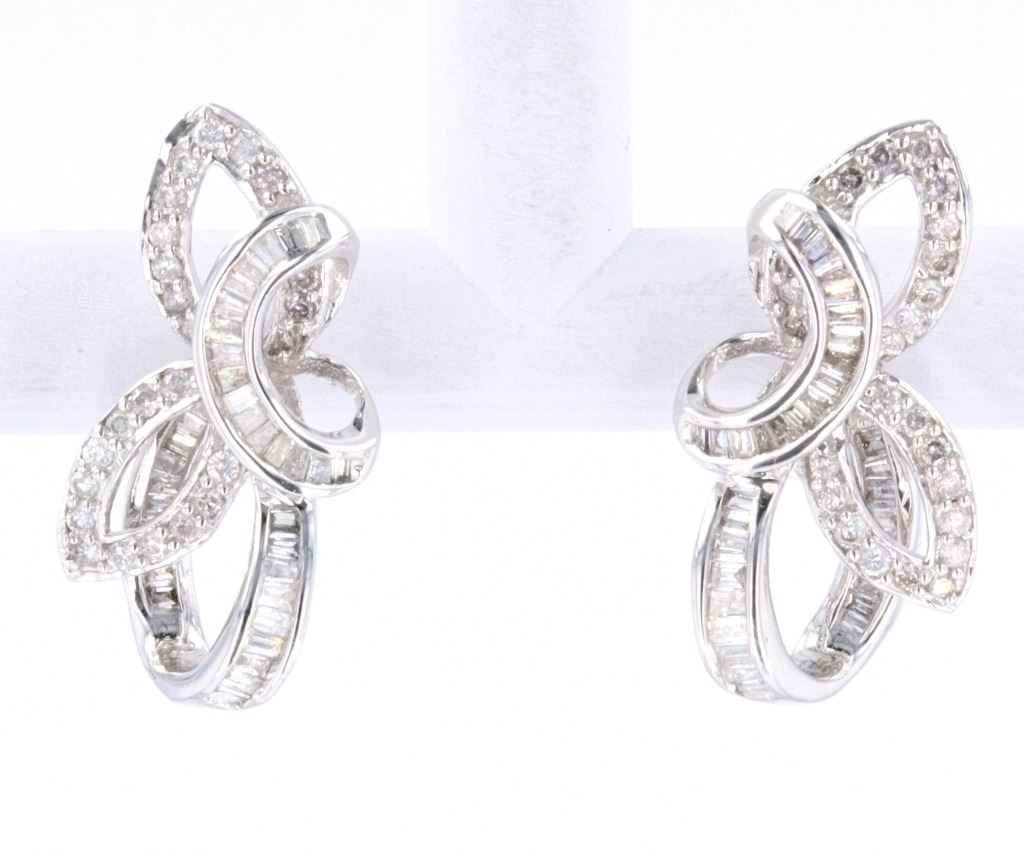 The lot features a modern ribbon Diamond set 18K gold stud earring in brand new condition. The stud earrings show an 18-karat white gold craftsmanship with gold weight of 5.06 grams having ribbon bezels being set with round brilliant and baguette cut Diamonds totaling 117 stones with a weight of 0.67 carats. The set is in brand-new condition.